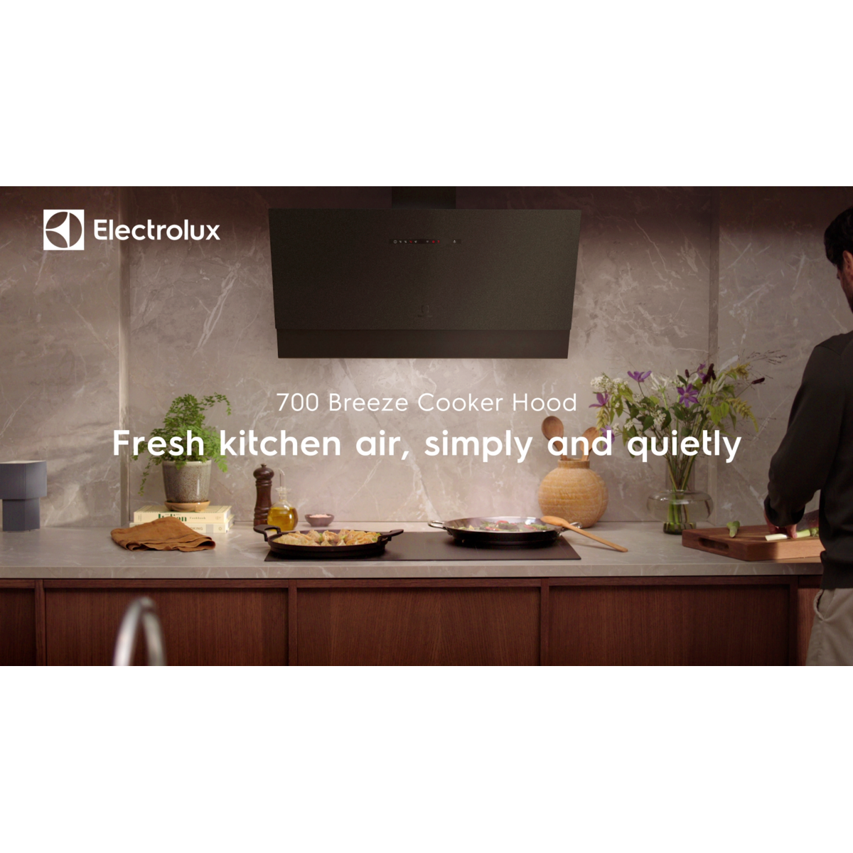Campana extractora decorativa de la Serie 700 Breeze de 60 cm «Beta Glass», nivel de ruido máximo 74 dB(A), 3 velocidades + potencia intensiva (730 m3/h), función Brisa, control táctil en el cristal (con colores blanco y rojo), tira LED (3000 °K), sistema Hob2Hood de conexión automática con una placa compatible, acero negro mate con panel de cristal negro