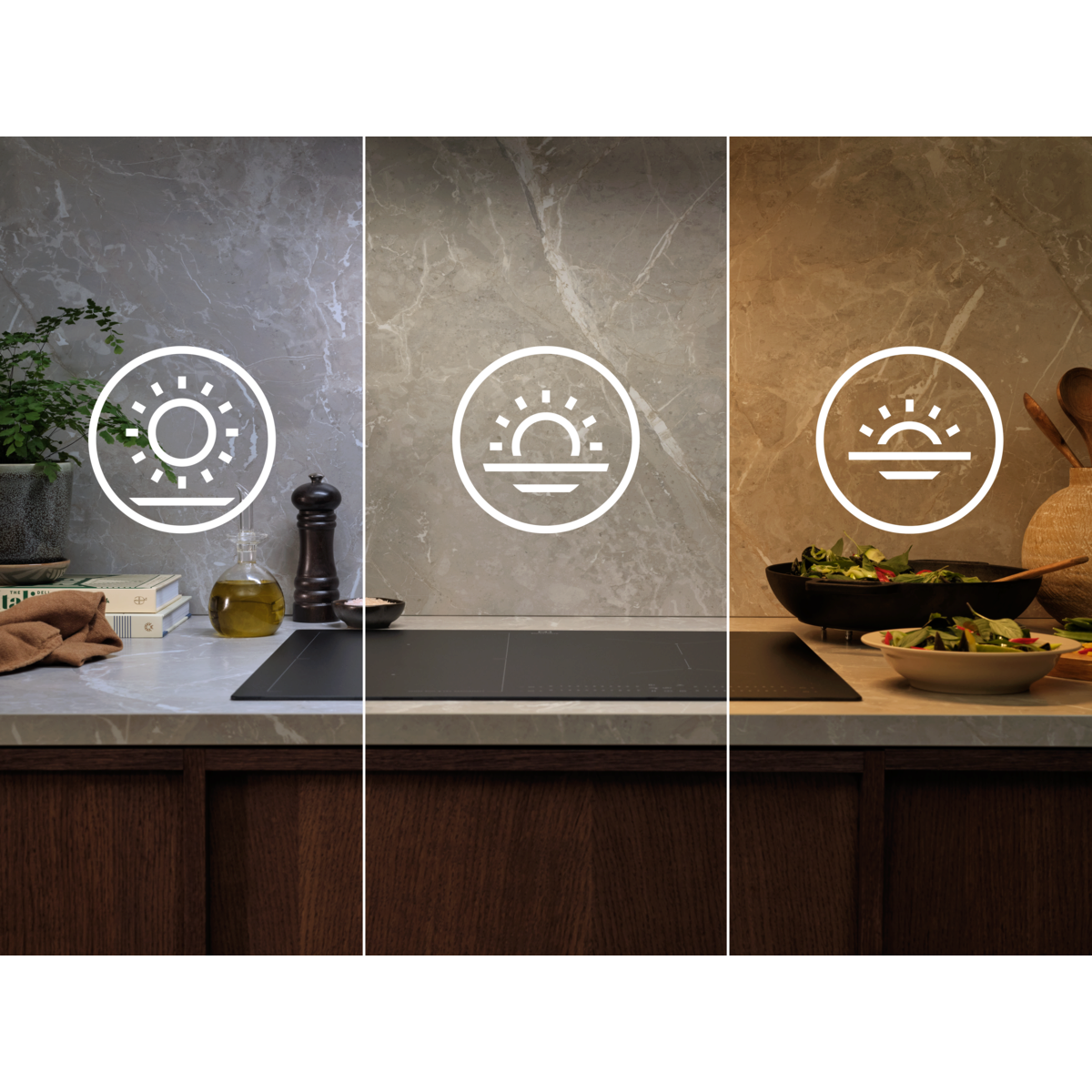 Campana extractora integrada «Myron» de la Serie 900 AutoSense de 54 cm, tres niveles de potencia + potencia intensiva, función Brisa, 680 m³/h, nivel de ruido máximo 66 dB(A), control electrónico, iluminación con tira de LED Perfect Illumination (5000 °K), reconocmimiento de vapores y olores automático AutoSense, cristal negro
