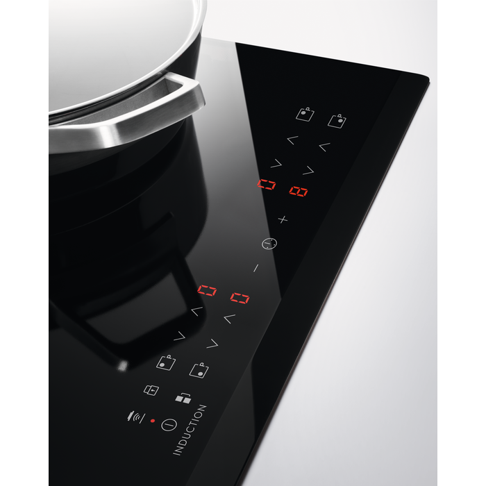 Placa de inducción biselada extraplana Infinite de 60 cm con 3 zonas de cocción una de ellas de 28 cm a 3,7 kW, Función Hob2Hood de control automático con una campana compatible, Control táctil independiente para cada zona, Temporizador, Función Pausa, Anclaje Easy Fix