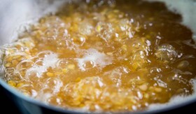 Cocer las lentejas rojas junto con una zanahoria entera pelada durante 8 minutos en agua hirviendo. Colarlas al finalizar y reservar el agua de la cocción.