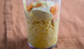 Echar las lentejas y la zanahoria en un vaso de batidora. Añadir pimienta negra, comino, curry, sal, un diente de ajo con el gérmen quitado, el tahín y el zumo de medio limón.