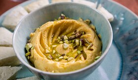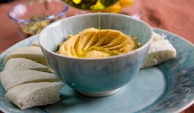 Para emplatar, trocear los pistachos ligeramente, espolvorear sobre el hummus que hemos vertido en un cuenco o plato hondo y regar con hilillo de aceite de oliva virgen extra. Servir acompañado de pan ácimo, o panecillos ligeramente calientes para mojar.
