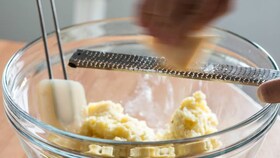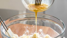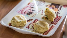Poner el puré de patata en un bol y añadir el huevo ligeramente batido y salado. Mezclar.