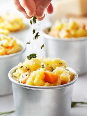 3 - Con la ayuda de un batidora eléctrica, hacer un puré con las patatas hasta que tenga una consistencia suave y sin grumos. Añadir la mantequilla, el queso parmesano y el huevo, Sazonar la pimienta negra, la sal y las hojas de salvia picadas. Añadir los dados de boniato y mezclar suavemente a mano.