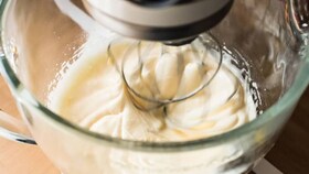 Cuando los huevos con el azúcar estén bien esponjados, añadir la mantequilla derretida y batir a baja velocidad.