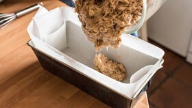 Forrar un molde rectangular con papel de hornear y verter la mezcla.