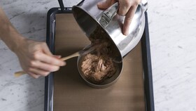 Bate los tres huevos con el azúcar en un bol hasta que se disuelva el azúcar. Bate la mezcla hasta que el volumen se triplique. A continuación, tamiza el almidón de patata con la harina, el cacao en polvo y la levadura. Después mezcla los ingredientes secos con la mezcla de huevo batido. Vierte la mezcla en un molde de pastel de 16 cm.