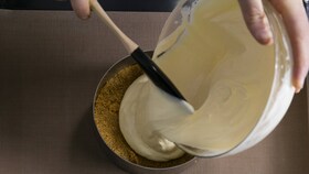 Vierte el relleno sobre la base y hornea durante 15 minutos a 180 °C. A continuación, reduce la temperatura a 120 °C durante otros 25 minutos o hasta que esté firme y solo el centro se mueva y tenga aspecto húmedo. Saca el molde del horno y colócalo en una parrilla de metal. Deja enfriar hasta que quede bien cuajado, suave y sedoso.